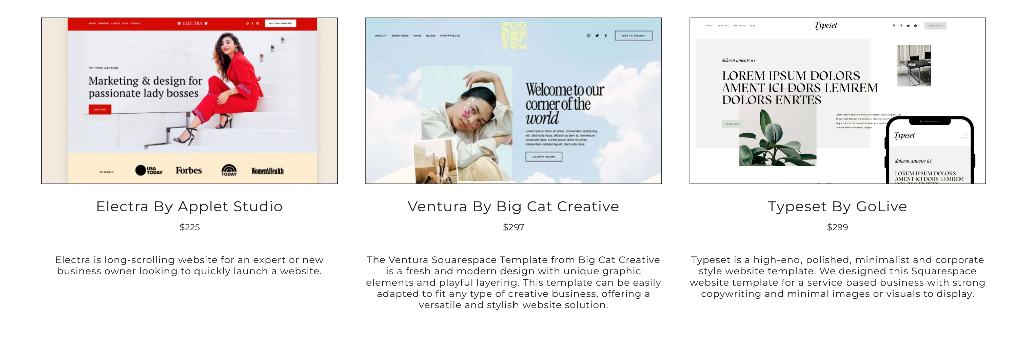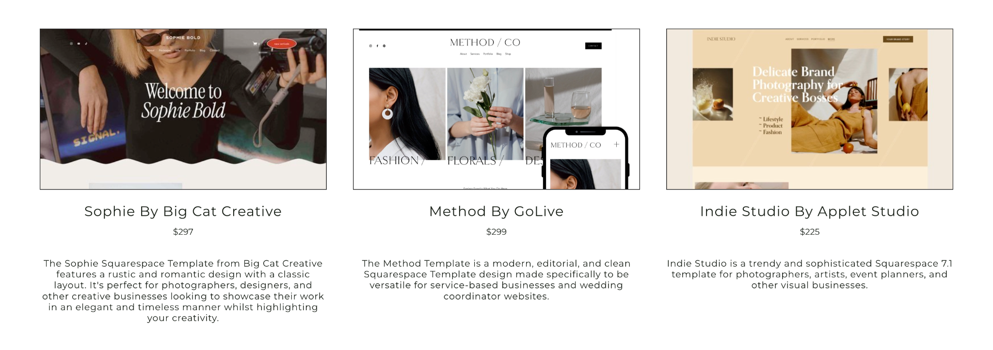 Squarewebsites, for example, offers many templates and plugins for Squarespace. This design company is a longtime Squarespace Circle Member, meaning it’s affiliated with the platform but not owned by it. Squarespace also offers some basic templates within the platform.